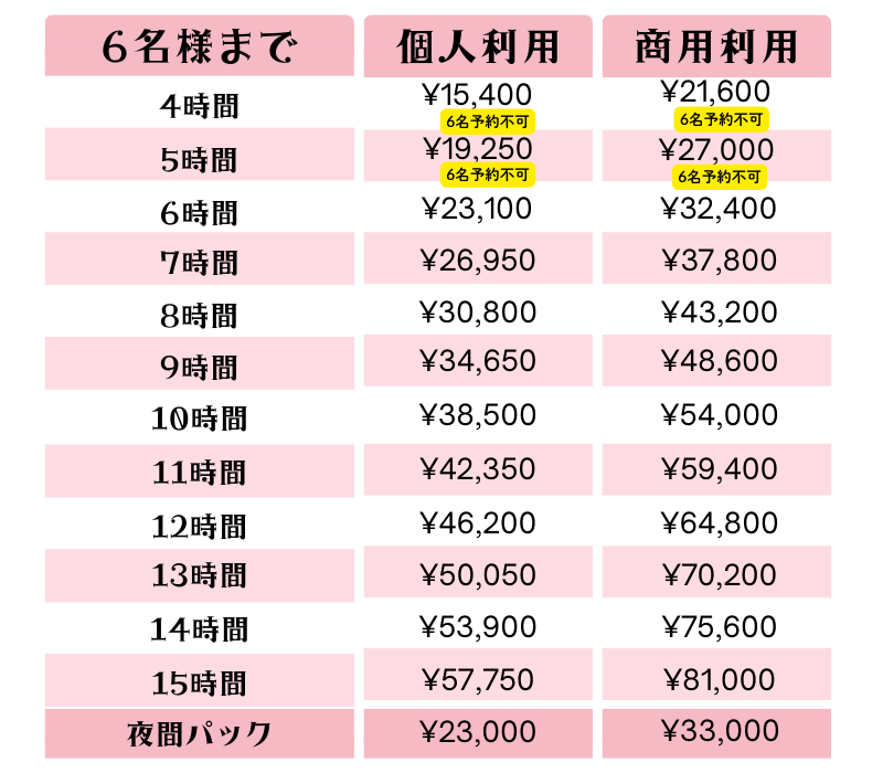 個人利用にてご予約頂いていたにも関わらず商用利用の撮影を行っていた場合には、違約金として倍額を追加で頂戴することになりますので、予めご了承ください。