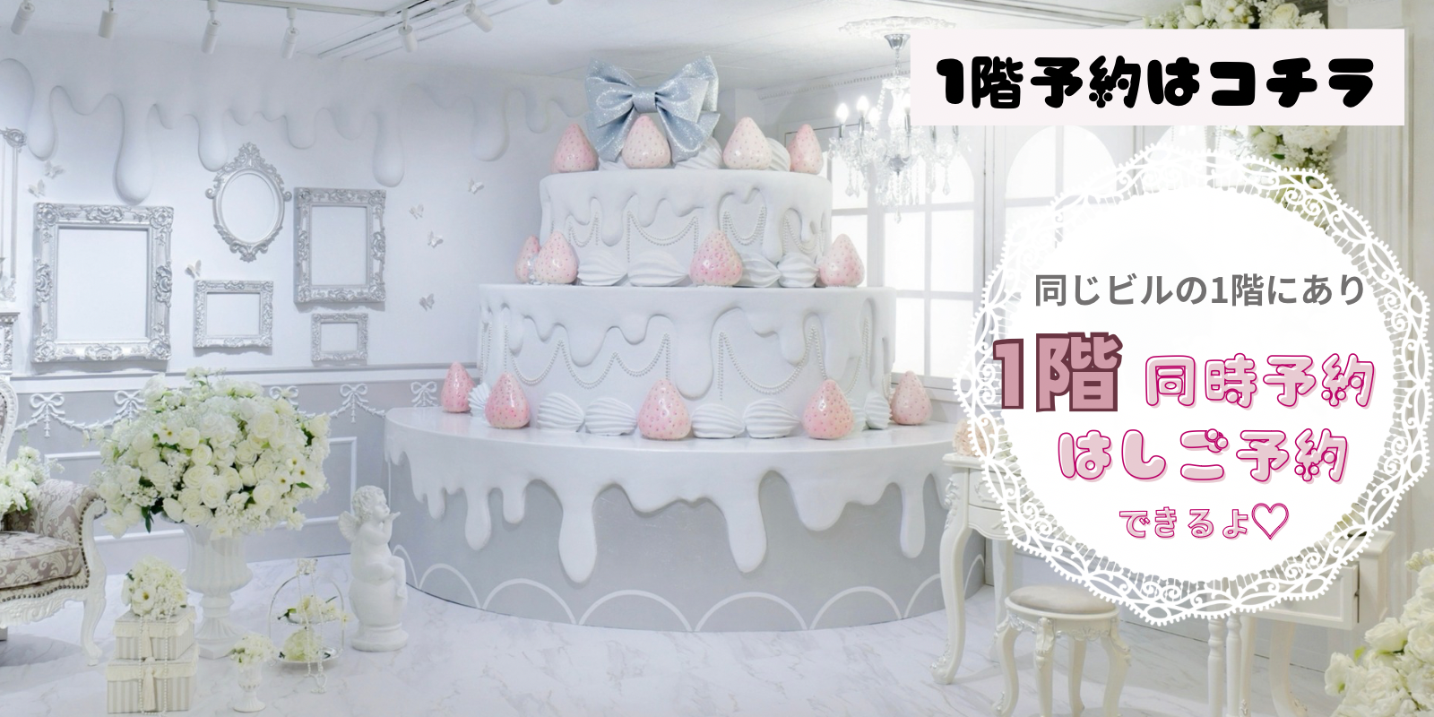 高さ約2mの立体ケーキに、パールのデコレーションや淡いピンクの苺、リボンのトップが輝くフォトジェニック空間🎂✨ケーキに座って撮影ができちゃう✨